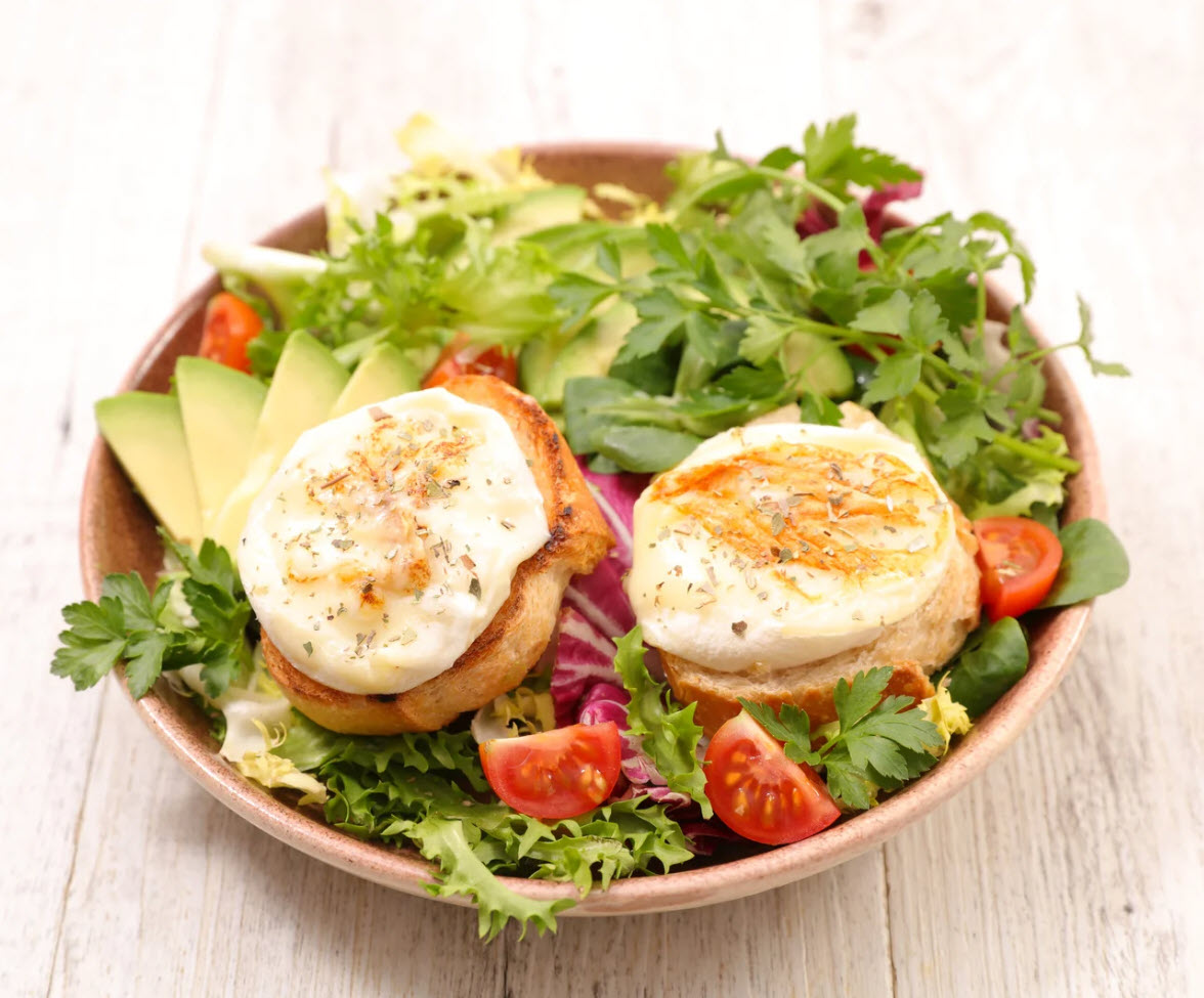 salade verte, tomates cerises, croutons de chèvre, lardons, persil